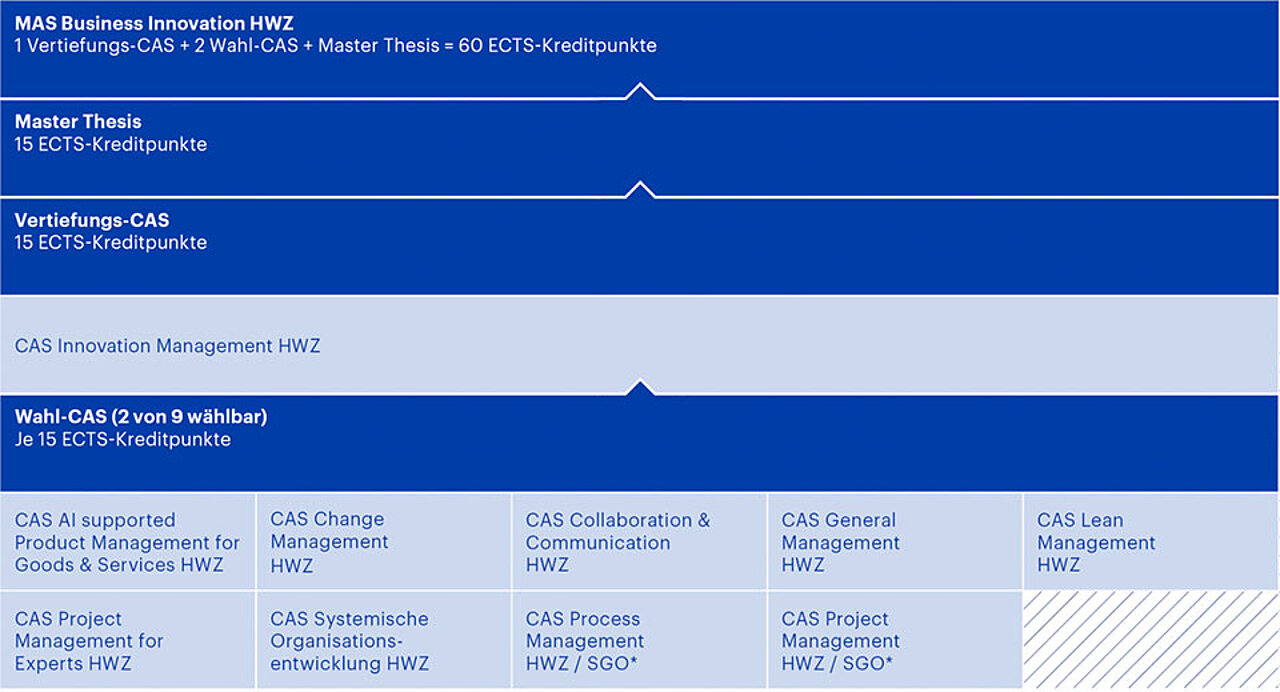 Die Weiterbildung MAS Business Innovation steht in einem engen Bezug zu Deinem Erfahrungsfeld. Es ist üblich, dass Studierende z. B. im Rahmen der Master Thesis, aber auch im Unterricht Beispiele aus der eigenen Firma einbringen, wobei diesbezüglich selbstverständlich strikte Vertraulichkeit gilt. Der Studiengang ist semesterunabhängig aufgebaut und besteht aus drei CAS-Modulen (Certificate of Advanced Studies). Die Erarbeitung der Master Thesis (Diplomarbeit) bildet den Abschluss des Studiums. Für das Studium hast Du fünf Jahre Zeit.